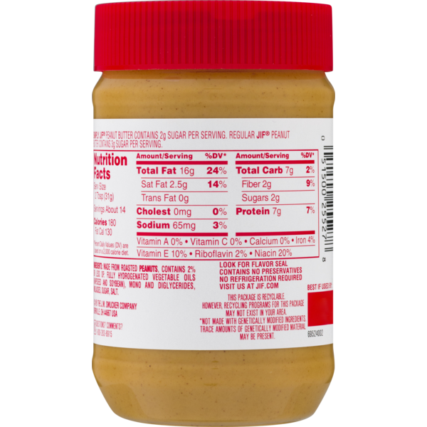 Creamy Peanut Butter - Jif Nutrition Facts Serving Size 2 Tbsp (33g) Amount Per Serving Calories 190 % Daily Value* Total Fat 16g 21 % Saturated Fat 3.5g 17 % Trans Fat 0g Cholesterol 0mg 0 % Sodium 140mg 6 % Total Carbohydrate 8g 3 % Dietary Fiber 2g 9 % Total Sugars 3g Incl 2g of Added Sugars 4 % Protein 7g 7 % Vitamin D 0mcg 0% Calcium 17mg 2% Iron 1mg 4% Potassium 185mg Jif Peanut Butter Label - TheRescipes.info Fresh-roasted peanut taste with low sodium* with 33% less total sugar** than Regular Jif Peanut Butter. *17g fat and 3.5g saturated fat per serving. **Simply Jif Peanut Butter contains 2g total sugar per serving. Regular Jif Peanut Butter contains 3g total sugar per serving. Available Sizes: 15.5 OZ Plastic Jar, 27.3 OZ Plastic Jar.