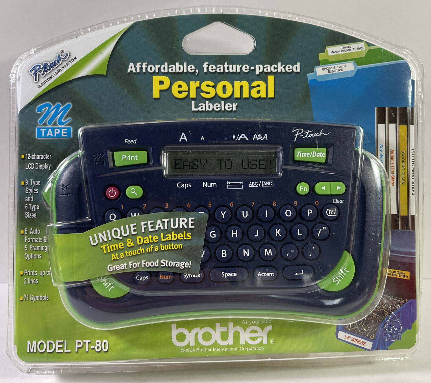 Brother P-Touch PT-80: Pt-80 Affordable Personal Labeler, 2 Lines, 6-4/ ... Brother P-Touch PT-80 [ BRTPT80 ]: Pt-80 Affordable Personal Labeler, 2 Lines, 6-4/5w x 4d x 2-3/10h. Handheld, affordable & easy to use - the perfect label maker for home, kids, crafts, small office or school. Features a time & date function which is ideal for labeling time-sensitive items. Repeat printing (one-nine copies) for quick multiple labels. 70 different symbols, vertical ...