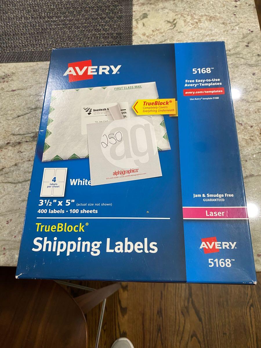 Matte White 3.5" x 5" Shipping Labels with TrueBlock Technology | Avery ... 5168 Quantity $ 55.99 Regular Price $ 55.99 Add to Cart Add to Favourites Professionally Printed & Delivered No setup fees 2 day shipping Avery ® White Rectangle Labels with TrueBlock ® and Sure Feed ™ Technology adhere reliably to envelopes, boxes, bottles, pouches and more, while completely covering everything underneath!