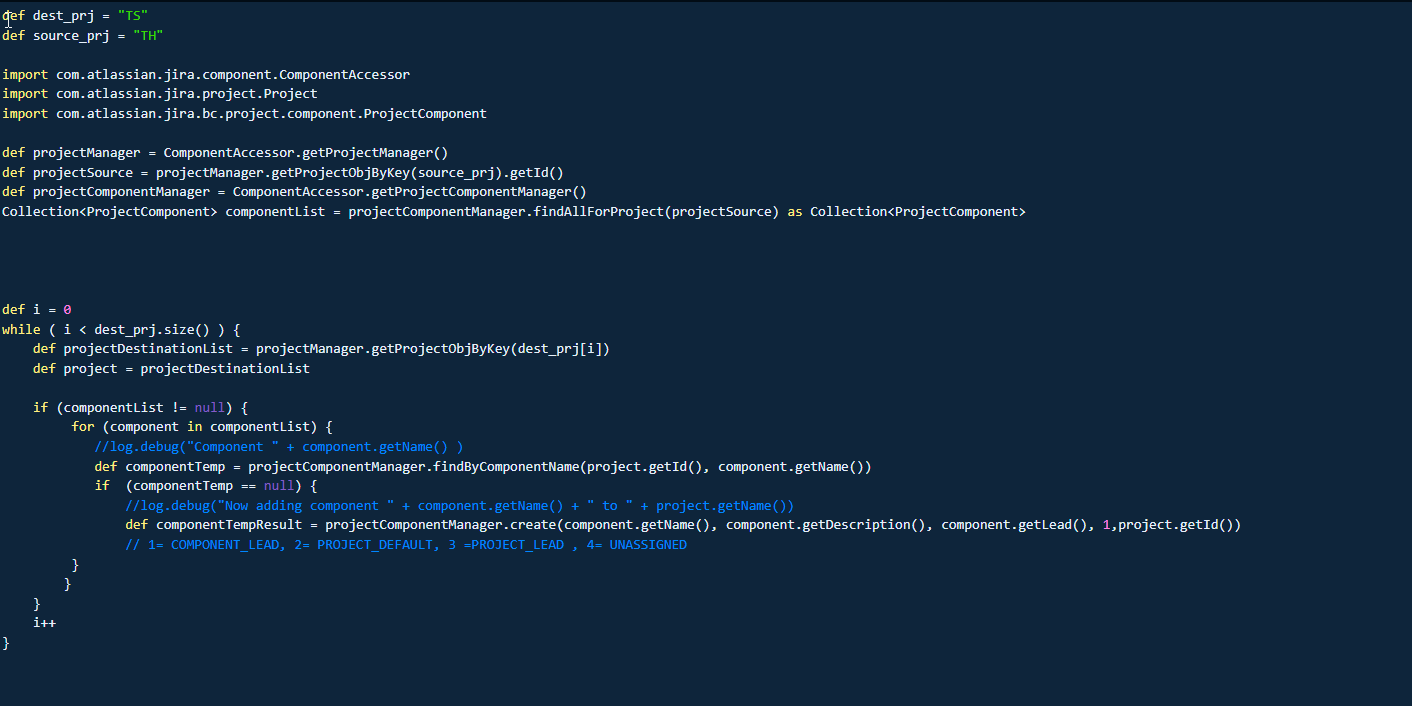 Jira create component. Managing components | Administering Jira applications Data Center and ... Adding a new component The Add Component form is located at the top of the 'Components' screen. Enter the Name for the component. Optionally, enter a Description, and select a Component Lead and Default Assignee (see options below). Click Add. Selecting a Default Assignee You can optionally set a Default Assignee for a component. How do I create components in a new project? - Atlassian Community You should create a classic project. Welcome to the community. In order to add new components to Jira project which can then be selected on the project's issues you need to add component in project admin section and thus need to have project admin rights which are different from jira system admin rights. ComponentAccessor (Atlassian JIRA 7.6.1 API) Returns the core component of the given Type (a Class or an Interface) which is stored in JIRA's Dependency Injection container. First it tries to find the component using the given Class as a key (like getComponent(Class)), however, if this fails then it will try to find a unique component that implements/extends the given Class. This seems unlikely to be useful, but is included for now, for ... JIRA Structure - Create & Manage Epics and Stories Copying a JIRA Structure. With the Copy action, you can create a full copy of a structure, and, optionally, clone every issue in the structure. To create a copy of a structure, open the Manage Structures page using the top navigation Structure menu. Find the structure you'd like to copy and click the Copy link in the Operations column.