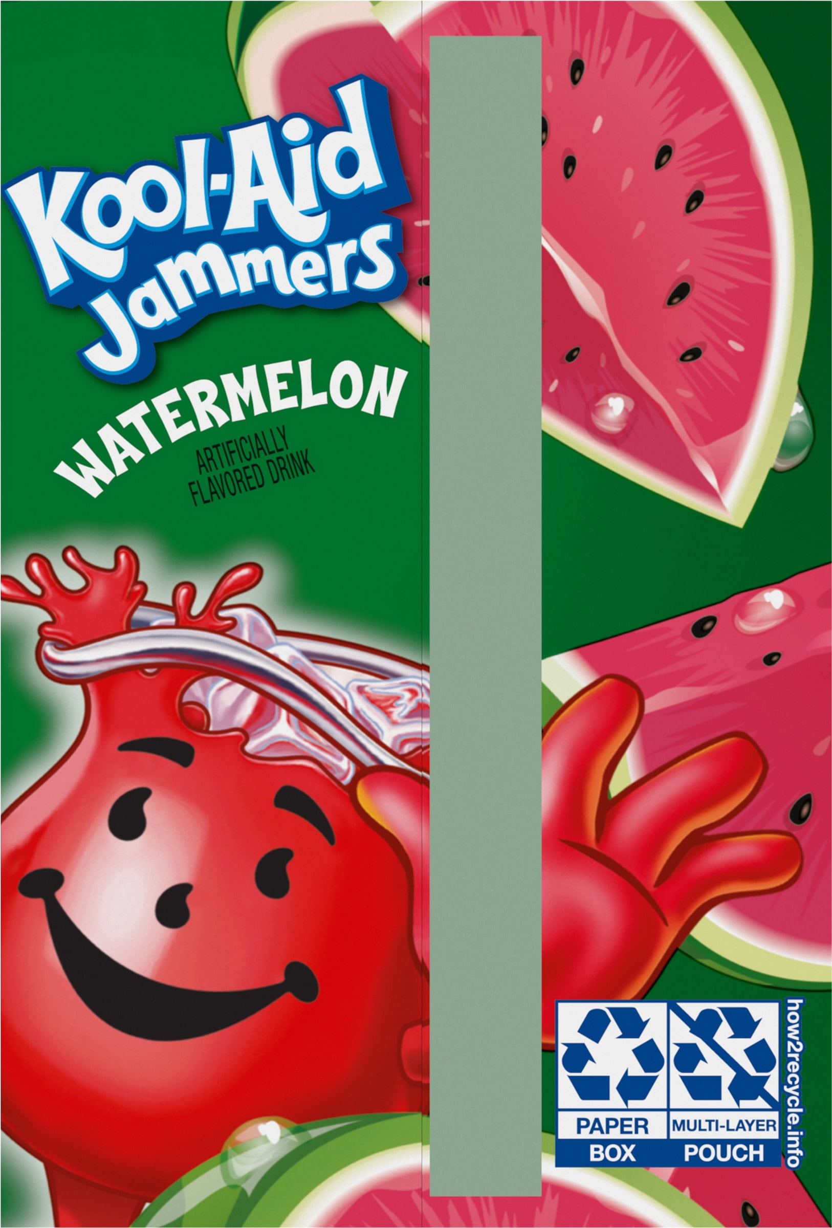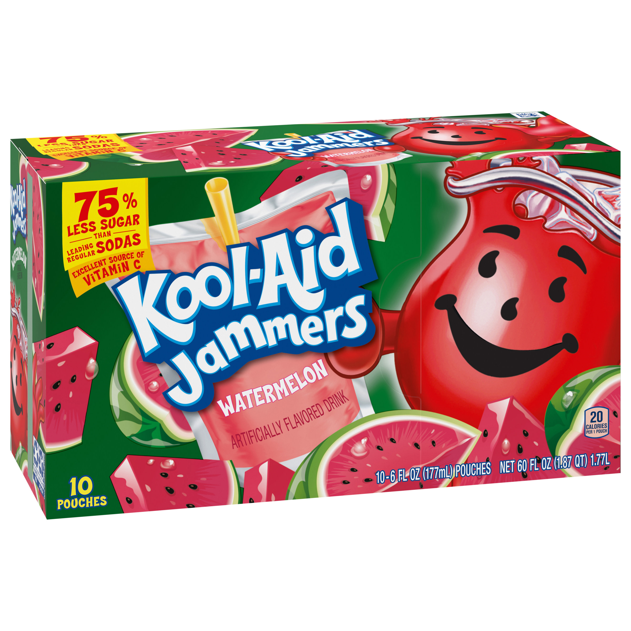 Kool-Aid Jammers Watermelon Artificially Flavored Drink, 10 ct Box, 6 ... Kool-Aid Jammers Artificially Flavored Watermelon Drinks are bursting with fun flavors Kool-Aid Jammers are easy to open, making them perfect for kids Contains 75% less sugar than leading regular sodas (Per 12 fl oz, this product 10g total sugar, leading regular sodas 40g total sugar) Kids love our drink pouches packed with fruit flavors