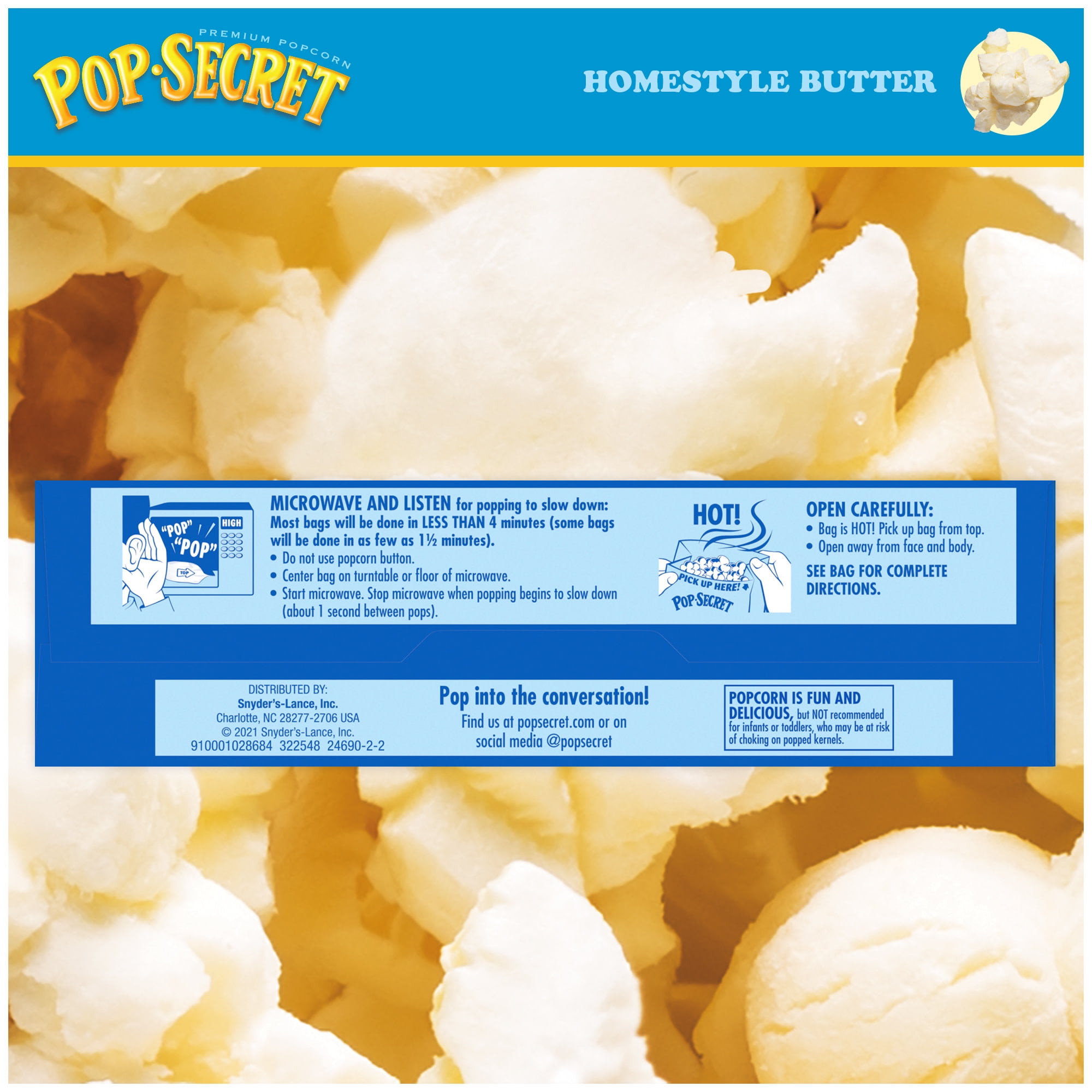 How Many Calories In A Full Bag Of Pop Secret Popcorn? Popcorn, Popped In Oil, Buttered, Pop Secret Butter (1 Pop Secret bag) has 35.8% total carbs, 29.4 grams net carbs, 41.5 grams fat, 5.9 grams protein, and 524 calories. Is a Pop Secret 100 Calorie Pop Microwave Popcorn Butter Snack Bag good for you? You can order from our website and have it delivered to your door. Popcorn is a fun and tasty snack, but it should not be served to children under ...