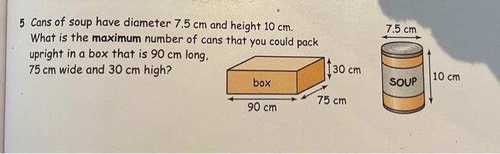 Grandma's Soup Company packages tomato soup that serves four... A soup can is in the shape of a cylinder. The can has a volume of 342 cm3 and a diameter of 6 cm. Express the height of the can in terms of π. Determine the maximum number of soup cans that can be stacked on their base between two shelves if the distance between the shelves is exactly 36 cm. Explain your answer. See Answer