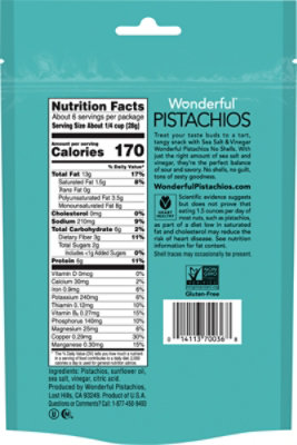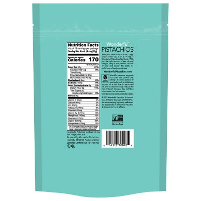 Wonderful Pistachios Roasted & Salted No Shells - Stop & Shop Nutrition Facts ; Cholesterol: 0mg 0 ; Sodium: 105mg 5 ; Potassium: mg 4 ; Total Carbohydrate: 6g 2; Dietary Fiber: 2g 7; Sugars: 2g ; Sugars: 2g.