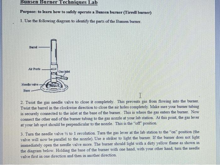 2021 BSN Bunsen-Burner-Lab - Experiment No. 5 The Bunsen Burner Part 1 ... 1. Sketch one of the Bunsen burners from the lab. 2. Identify and label its parts using the guide sheet! 3. Give the purpose of each part of the Bunsen Burner! 4. What parts of the Bunsen burner allow air to be mixed in with the gas? Why do the gas and air need to be mixed. Part 2: Setting Up a Bunsen Burner (View the video link)