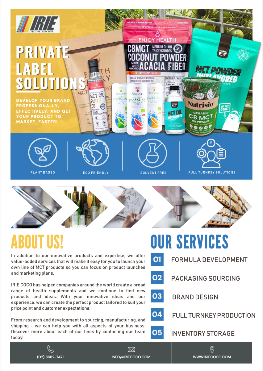 PRIVATE LABEL MCT PRODUCTS — MCT Oil and MCT Powder Supplier Let us be your private label packaging partner. PACKAGING SOURCING - All products generally come in ‘standard’ packaging formats and sizes. However, we work with multiple packaging suppliers to provide you with a variety of packaging options, suited to the product formats that we manufacture. Private Label MCT Oil Supplement, 120 Liquid Capsules at 3,000mg Our private label MCT Oil Supplement contains 3,000mg of Medium Chain Triglycerides (from Palm Oil) in every liquid capsule. 3,000mg of MCT Oil; NON-GMO; 120 Liquid Capsules; Other ingredients: Palm oil, gelatin (bovine) and vitamin E (d-alpha tocopheryl acetate). MCT Oil | Vitamix Labs Form: Liquid (MCT OIL) Flavor: Unflavored Packaging: 16oz Black PET Bullet Bottle, ... Vitamix Labs: Private Label Supplements and Custom Formulations. 80 Davids Dr ...