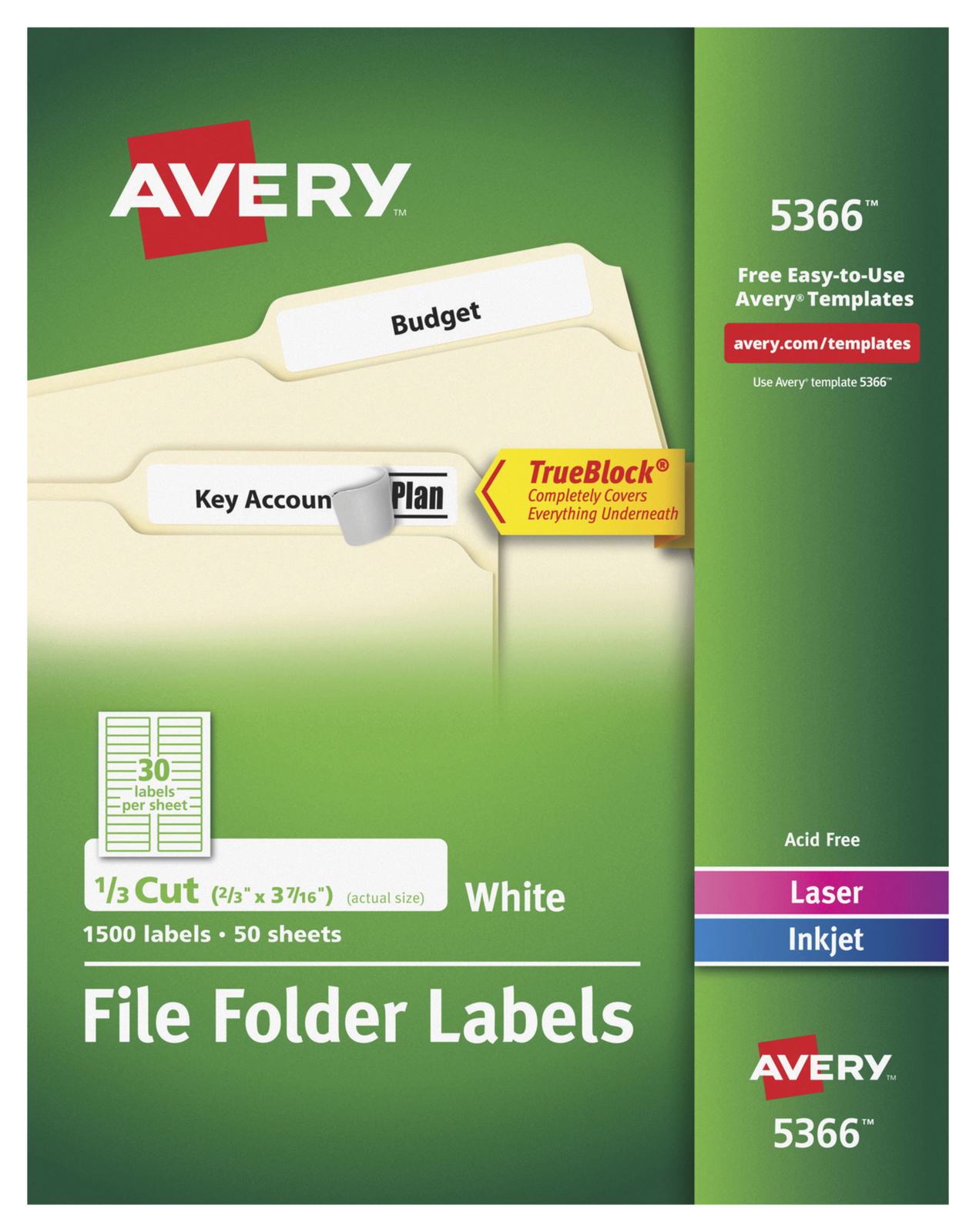 Template compatible with Avery® 5366 - Google Docs, PDF, Word Download free template for Google Docs compatible with Avery® 5366 Download for Word Download Microsoft Word template compatible with Avery® 5366 Dowload in PDF Download PDF template compatible with Avery® 5366 Label description Avery US Letter - 5366 File Folder Labels: It has 30 labels per sheet and print in US Letter.