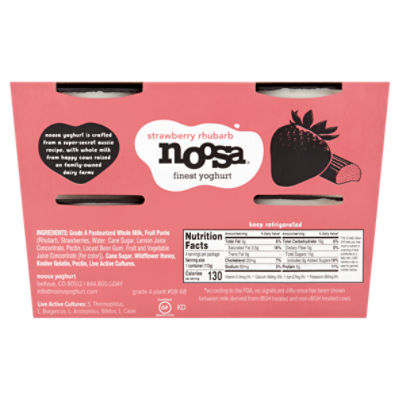 Noosa Yogurt, Strawberry Rhubarb: Calories, Nutrition ... - Fooducate Personalized health review for Noosa Yogurt, Strawberry Rhubarb: 270 calories, nutrition grade (B minus), problematic ingredients, and more. Learn the good & ... strawberry rhubarb yogurt | noosa Grade A Pasteurized Whole Milk, Fruit Purée (Rhubarb, Strawberries, Water, Cane Sugar, Lemon Juice Concentrate, Pectin, Locust Bean Gum, Fruit and Vegetable ... Noosa Yoghurt Whole Milk Yogurt Strawberry Rhubarb 8 oz Noosa Yoghurt Whole Milk Yogurt Strawberry Rhubarb 8 oz ; Saturated Fat6.0grm ; Trans Fat0.0grm ; Cholesterol 30.0mg ; Sodium 110.0mg ; Total Carbohydrate 34g ...